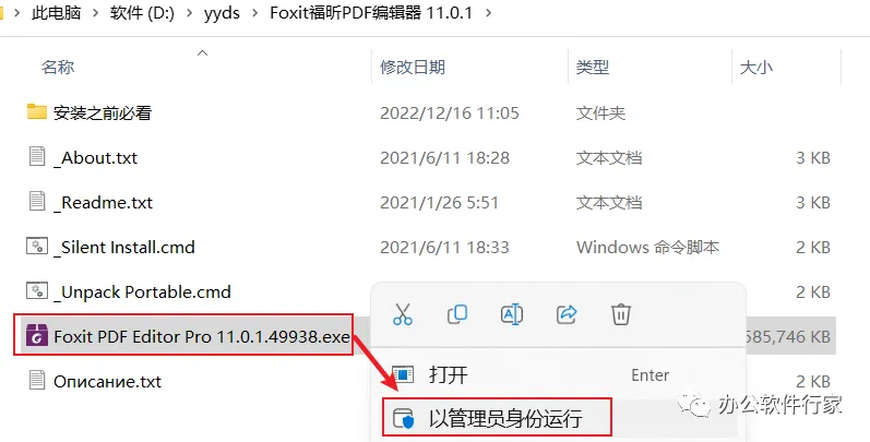 2、选中”Foxit PDF Editor Pro 11.0.1.49938“右键以管理员身份运行