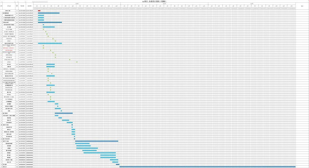 特点:包含房间、市政、装修等各阶段,各类型工程,推荐的两个自动表格,非常好用,只要选择时间段,即可自动生成横道图。