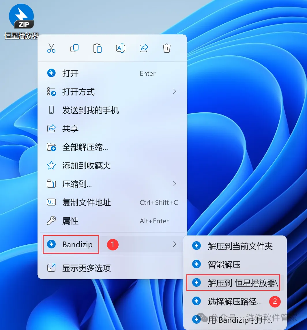 1、下载恒星播放器软件安装包到电脑上,右键选择【解压到恒星播放器\】