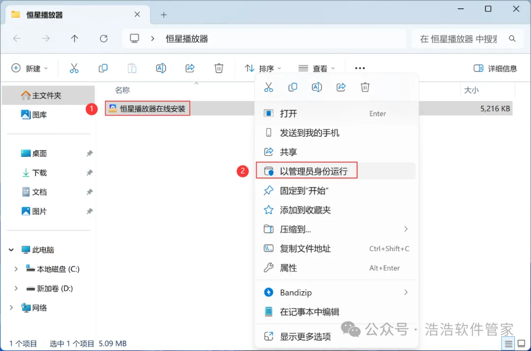 3、找到【恒星播放器】应用程序,右键选择【以管理员身份运行】它