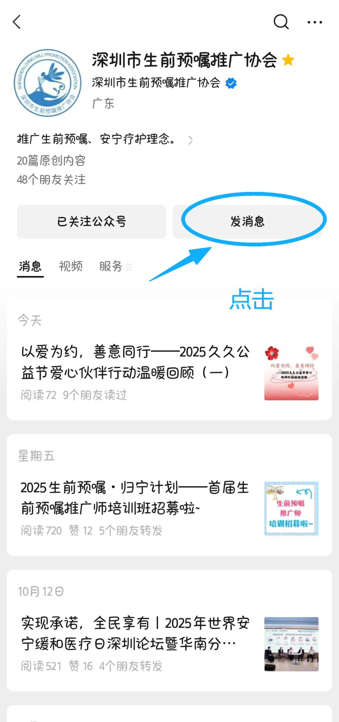 小编近期在后台收到多条留言咨询志愿驻点宣传活动的,现在此给大家做个统一回复:目前协会已在全市组建志愿者服务队共11支,在深圳市第二人民医院、深圳大学总医院设有恒常服务点开展生前预嘱推广咨询服务(第三个志愿服务点也在规划中啦~)。注册成为深圳志愿者,通过志愿深圳网站(sav.org.cn),选择主队或副队加入“深圳市生前预嘱推广志愿服务队”,即可成为我们的志愿者一员 ,期待您的加入。