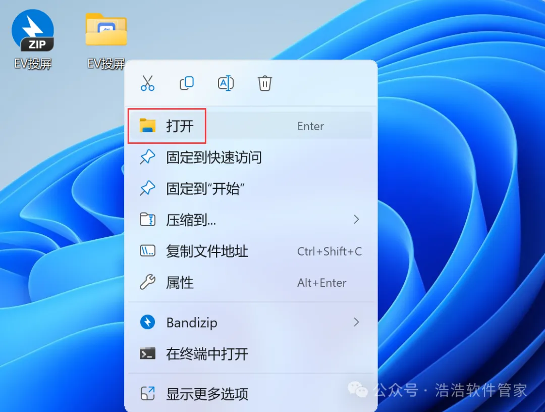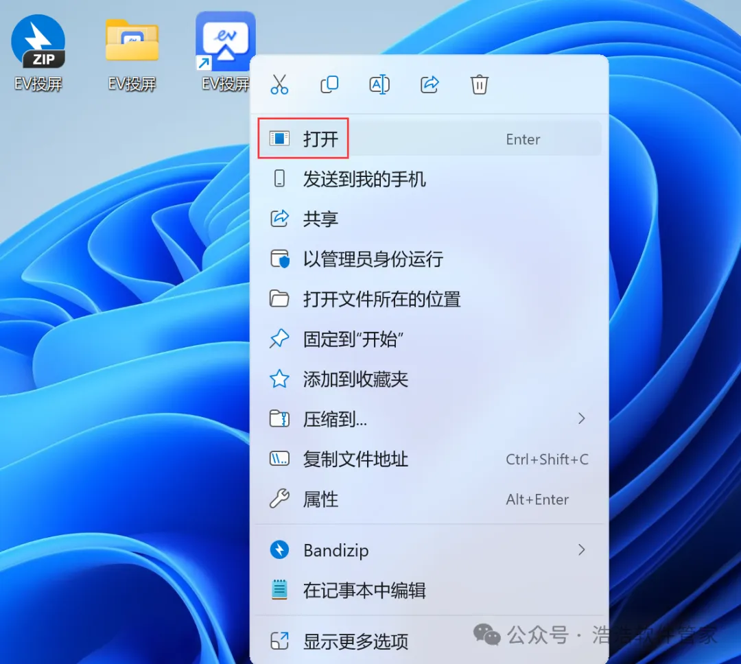 8、回到桌面,右键桌面上的【EV投屏软件图标】,点击【打开】
