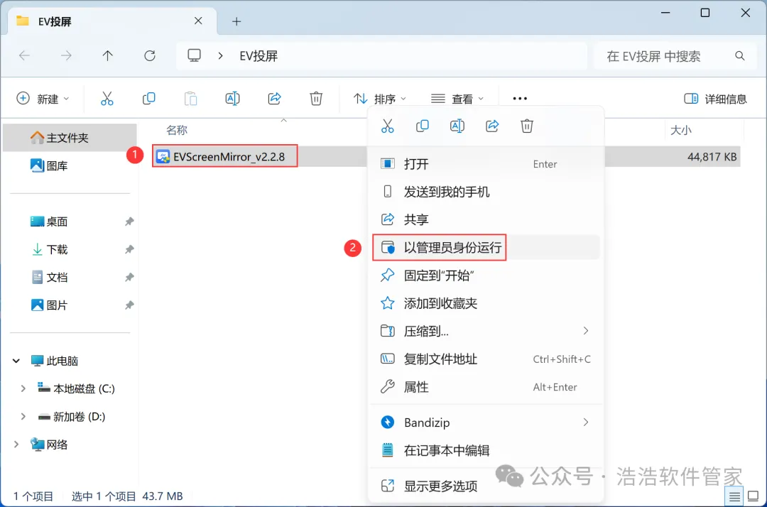 3、找到【EV投屏】应用程序,右键选择【以管理员身份运行】它