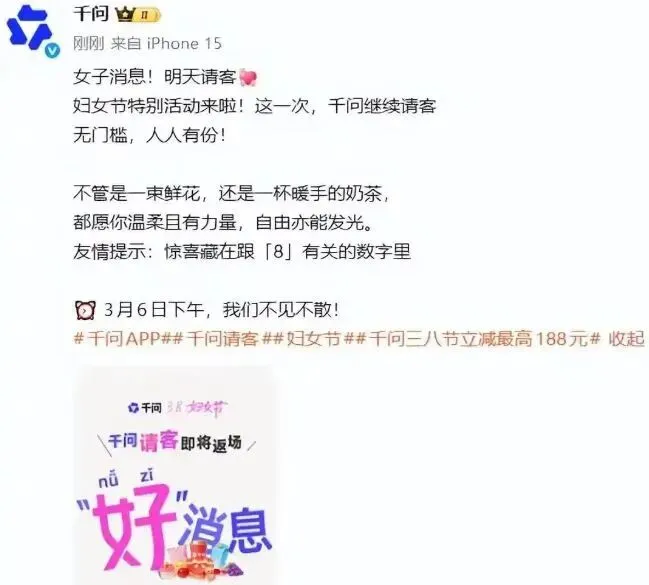 3月5日晚,@千问 官方发文称:“妇女节特别活动来啦!这一次,千问继续请客,无门槛,人人有份!”