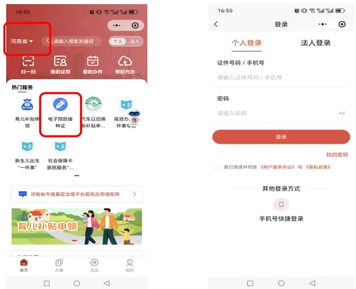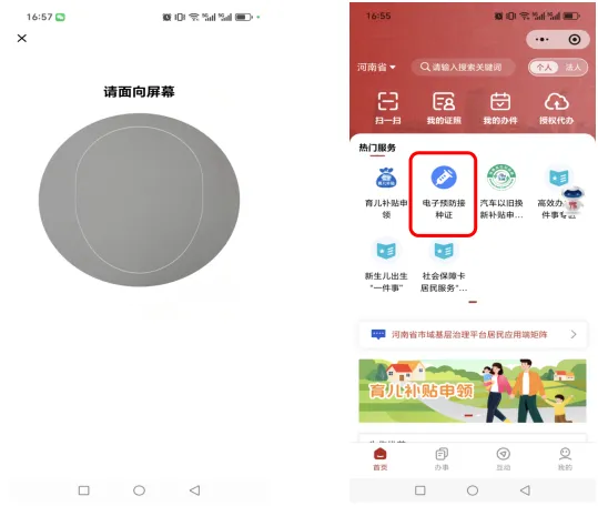 “豫事办小程序”/“豫事办 APP”——左上角选择地区为“河南省”——选择“电子预防接种证”——登录——前往认证——下一步——完成人脸认证,即申领成功——点击“电子预防接种证”,即可查看个人电子预防接种证。