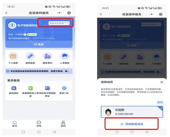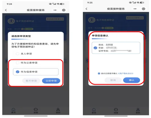 进入本人电子预防接种证界面——家庭成员管理——添加家庭成员——选择作为父亲申领/作为母亲申领、立即申领——确认孩子信息,即完成申领。