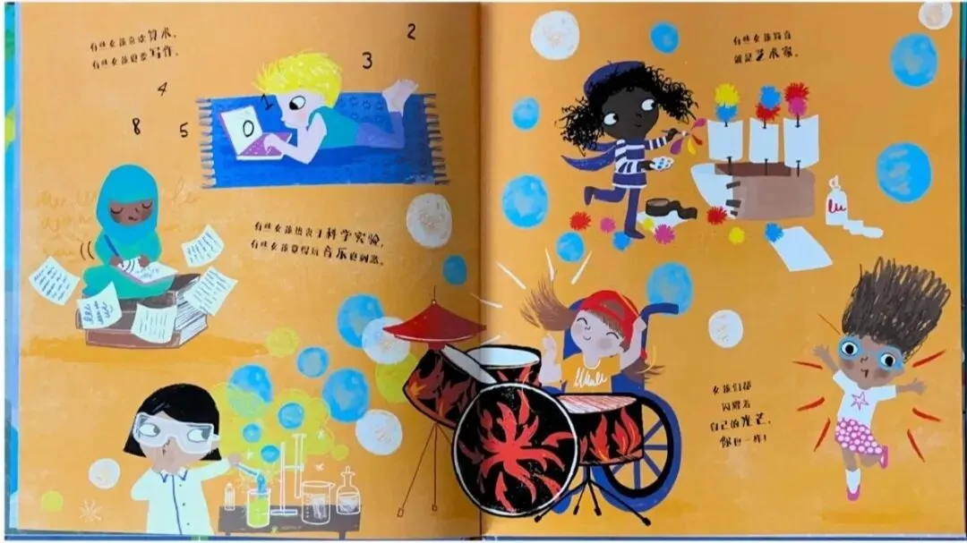 女孩们可以踢足球、篮球、棒球,甚至在冰球比赛中大显身手,赢得无数的分数!她们可以攀登高山和高原,勇往直前。女孩们能够在各种比赛中获得冠军!有些女孩热爱数学,有些女孩痴迷写作。有些女孩沉浸在科学实验的乐趣中,而有些女孩则发现音乐才是最激动人心的事情。还有一些女孩是真正的艺术家。她们每个人都闪耀着属于自己的光芒!而你,也是一样的!只要你坚定信念,就没有什么是你做不到的事情。我们每个人都需要拥有勇气和力量,孩子们,你们想要成为未来的什么呢?无论你们想做什么,你们一定无所不能,充满了无限的可能性!