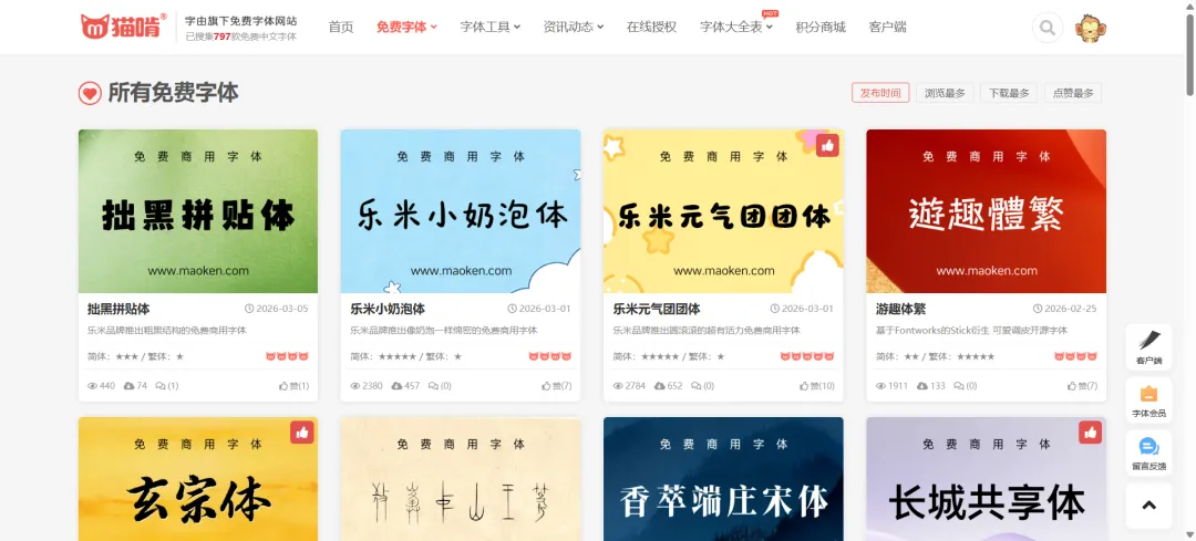 猫啃网是国内专注于中文免费商用字体整理与分享的垂直网站,定位清晰,核心优势在于“精准、靠谱”,尤其适合需要中文免费商用字体的个人创作者、自媒体人。