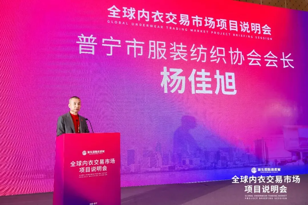 普宁市服装纺织协会会长杨佳旭立足普宁产业底蕴,剖析产业转型机遇,肯定项目对普宁产品走向全球的重要作用。全球内衣交易市场落户汕头,即将在今年8月盛大开业,为普宁纺织服装产业提供了难得的契机。他认为这一契机不仅是普宁纺织服装产业向产业链高端攀升的关键一步,更是普宁制造走向全国、走向世界的重要跳板。