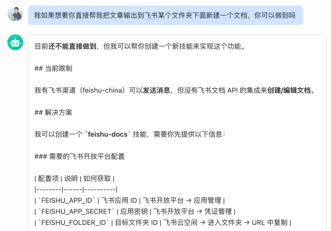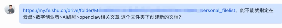 我当时直接跟 OpenClaw 说:帮我在飞书指定目录创建文档。