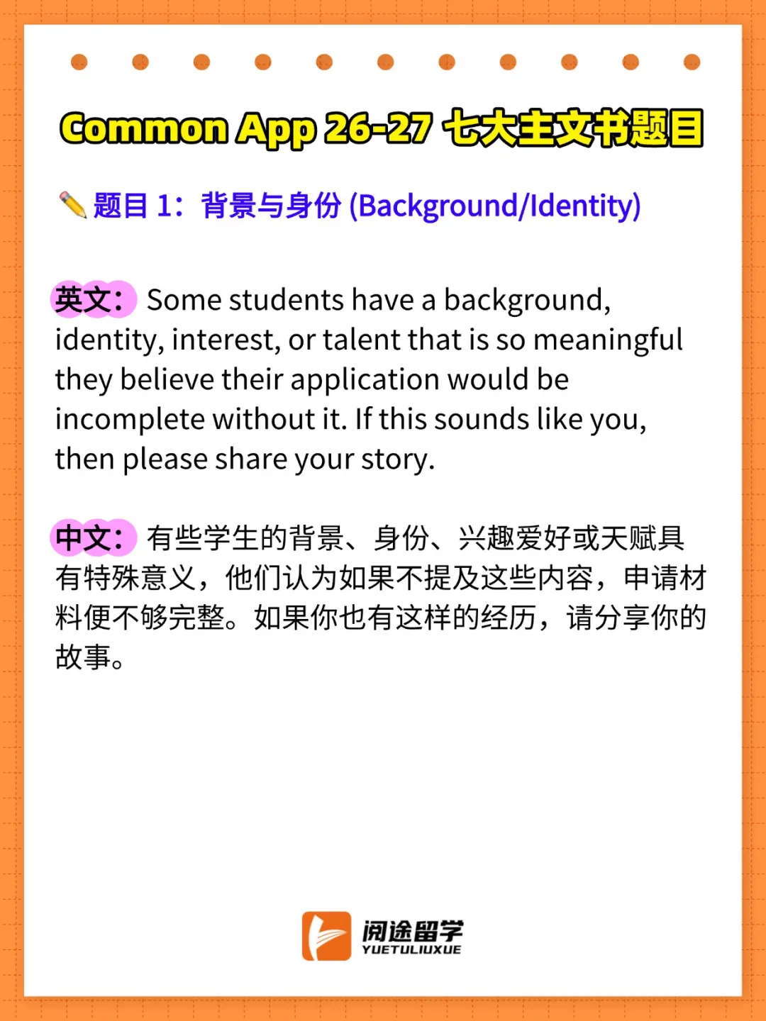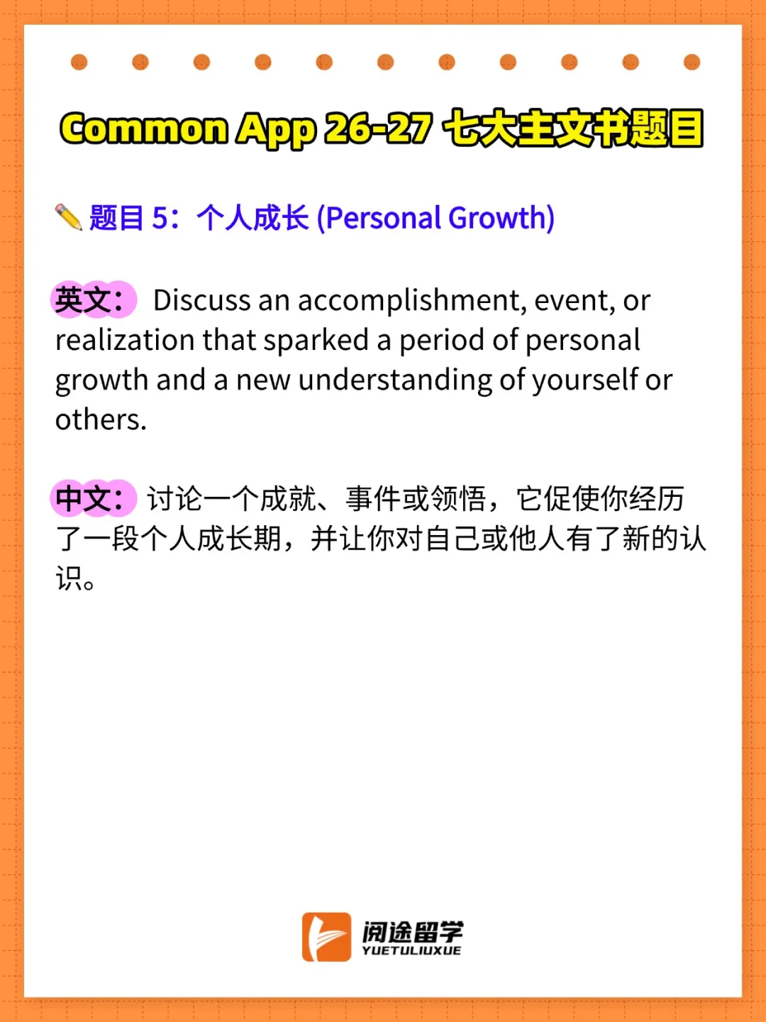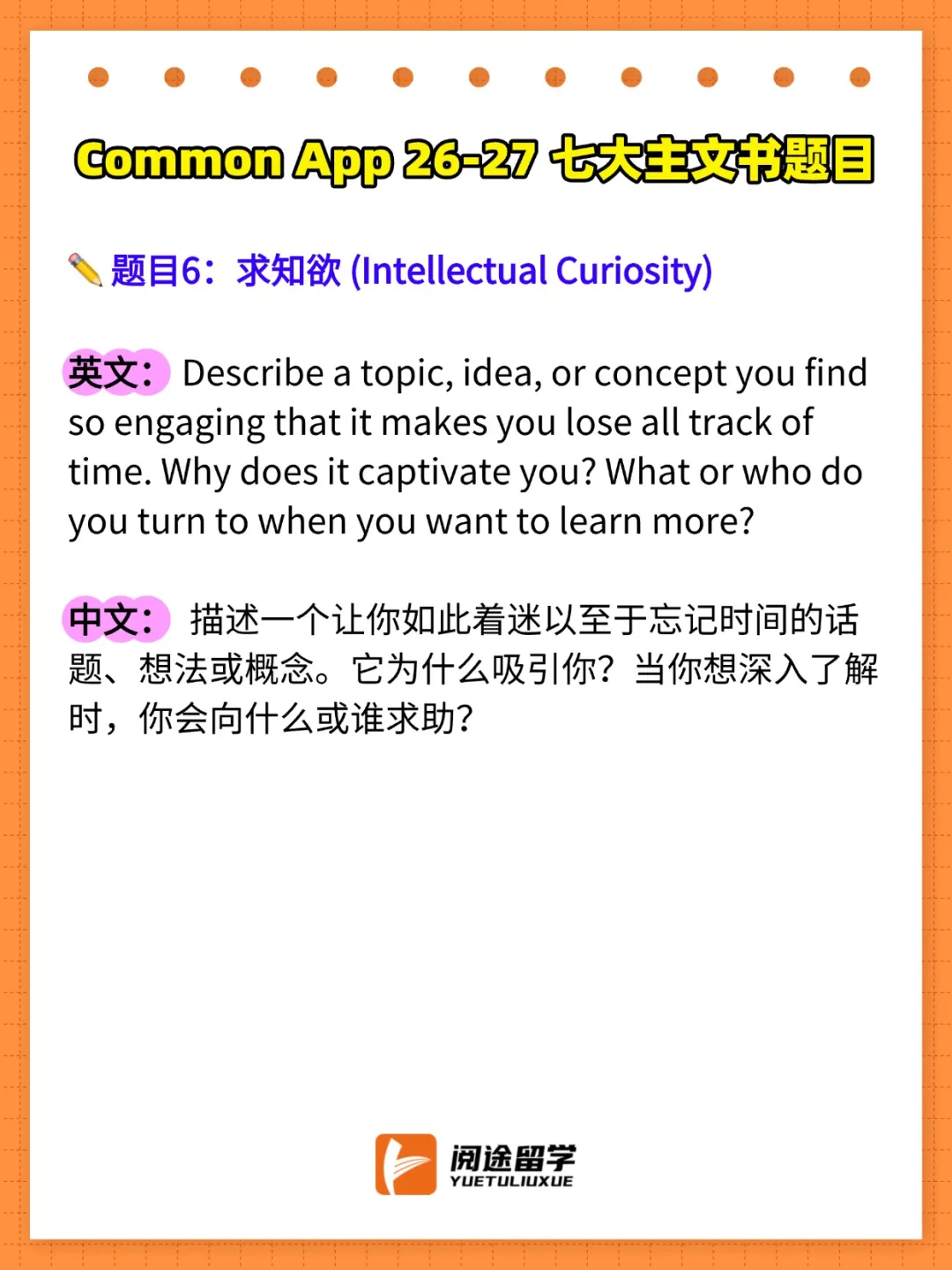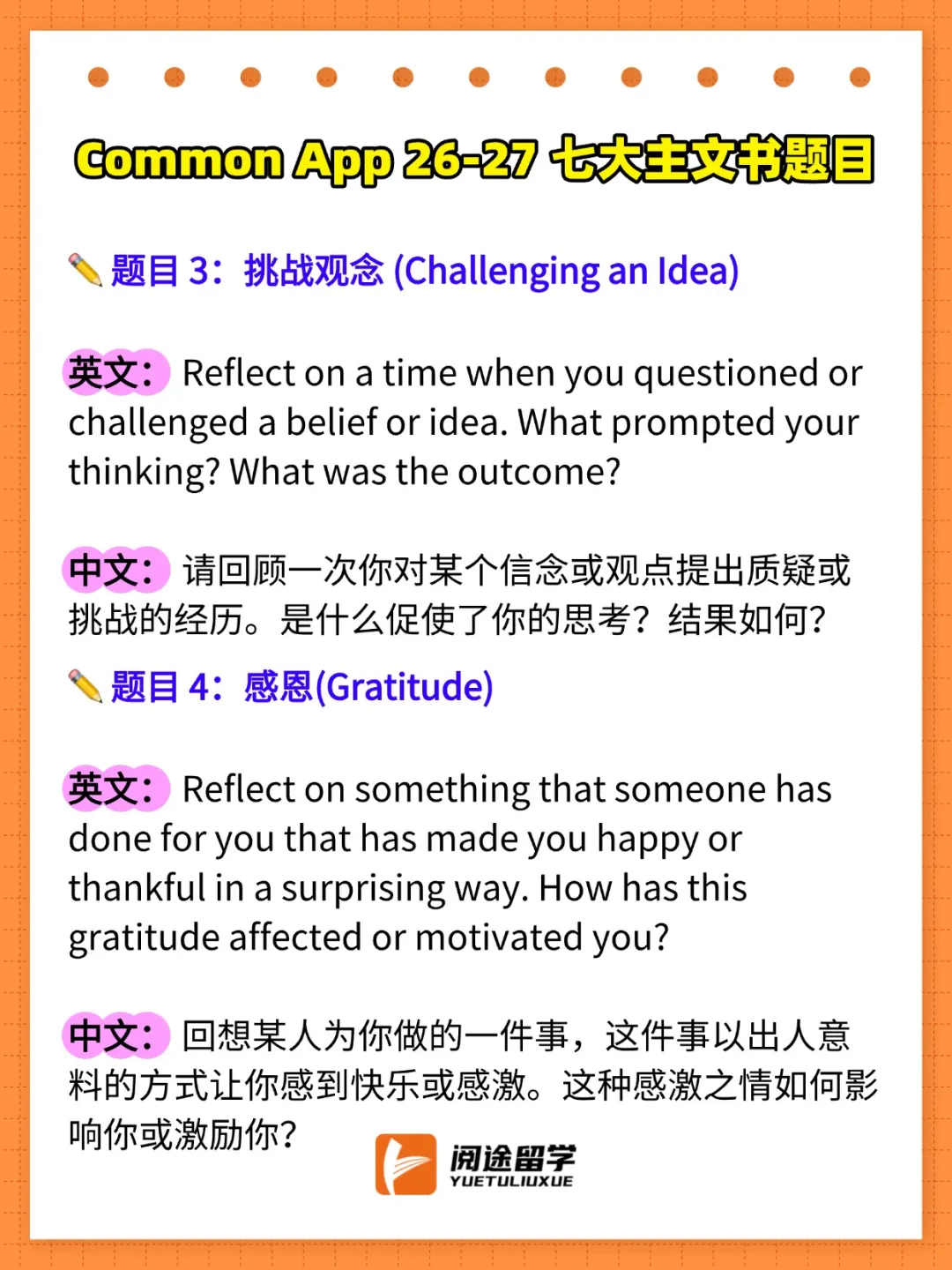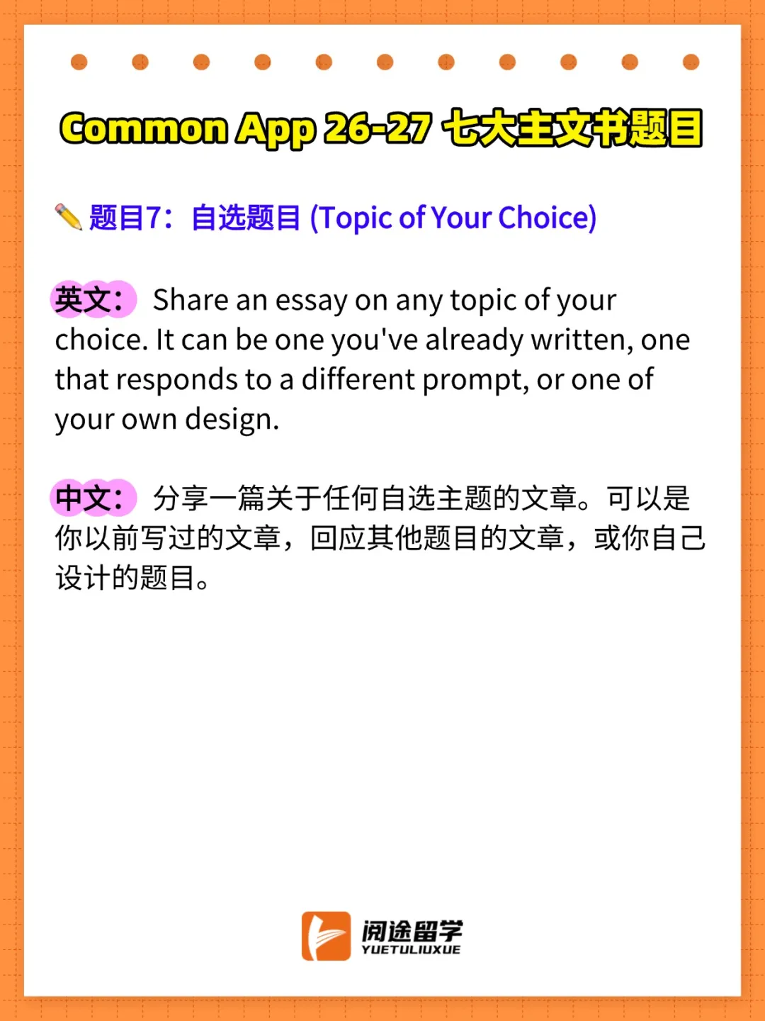今天,阅途留学就为大家带来2026-2027Common App主文书题目的完整解析,帮助你在申请季抢占先机!