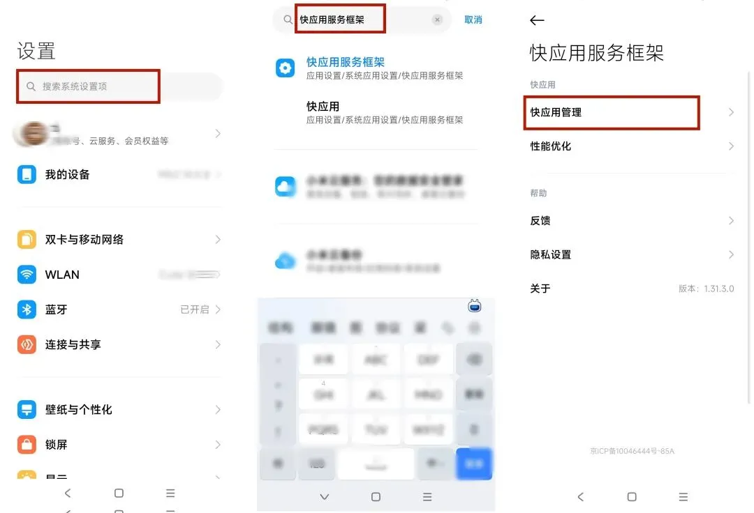 首先,打开手机设置,在搜索栏输入“快应用服务框架”,然后点击搜索,在快应用服务框架中选择“快应用管理”点击进入。