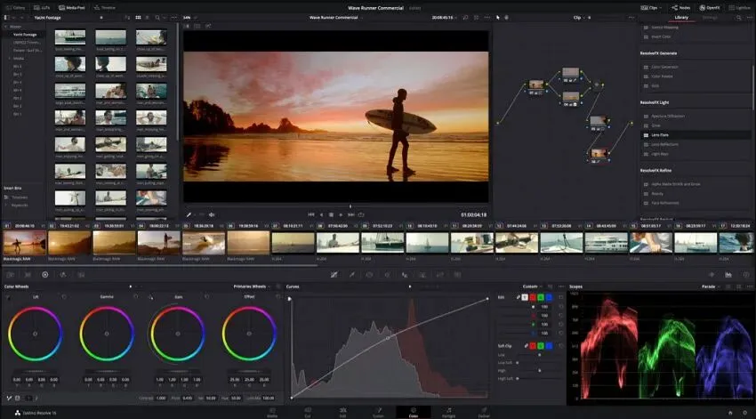 DaVinci Resolve 提供了一整套专业工具,包括剪辑、色彩校正、视觉效果(Fusion)和音频后期制作(Fairlight)。其基于节点的调色系统被认为是行业标准。该软件非常强大,能够处理几乎任何项目。