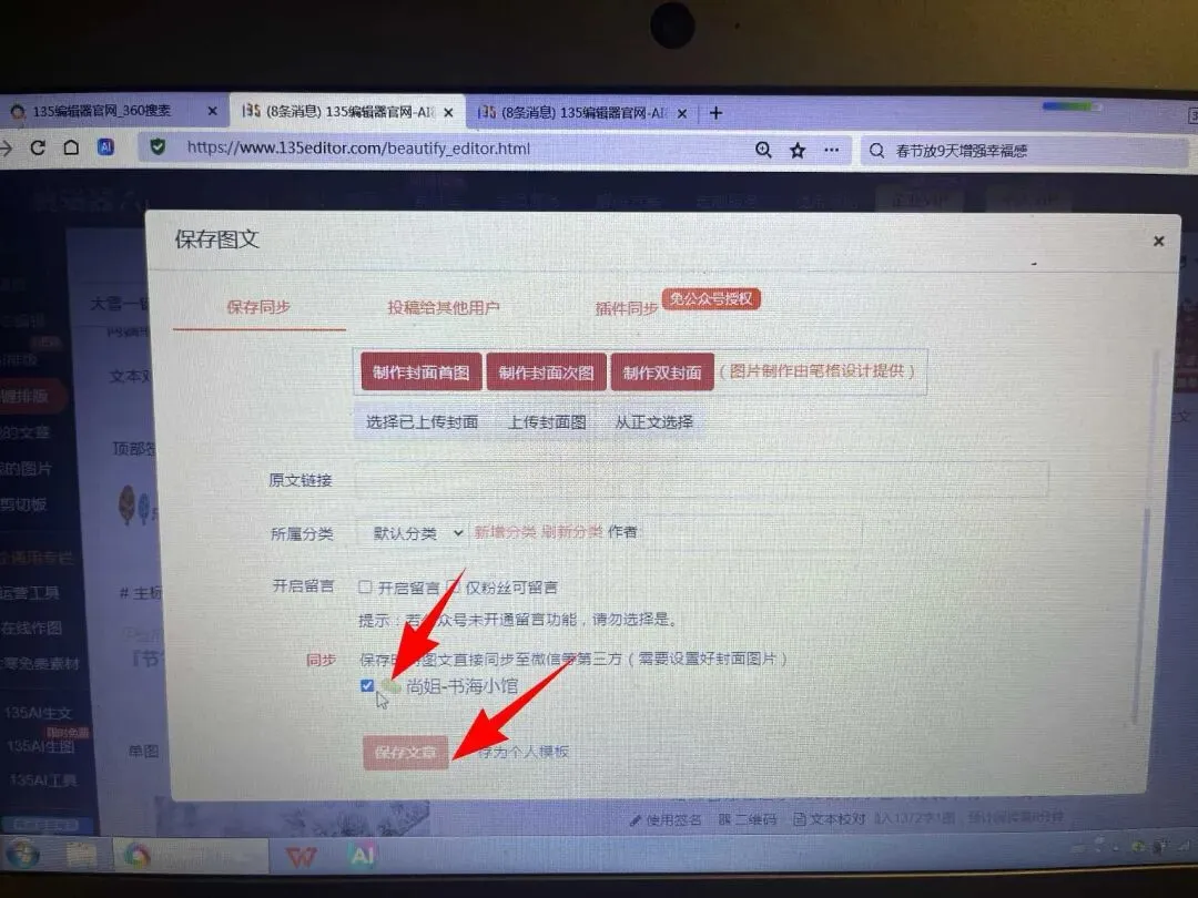账号要绑定:选上自己账号:保存文章