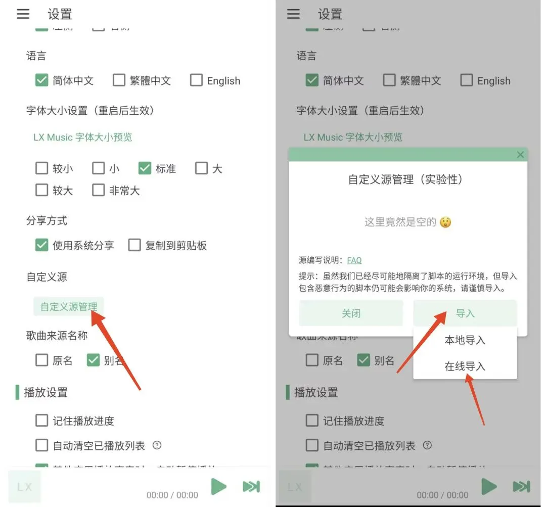 导入音源教程:在设置中找到自定义源管理→在线导入→复制粘贴音源(下面会提供音源)→导入成功后,再勾选该音源,显示初始化成功即可使用!