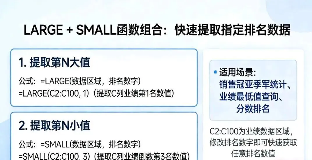 例: =SMALL(C2:C100, 3) ,一键提取 C 列业绩倒数第 3 名的数值。