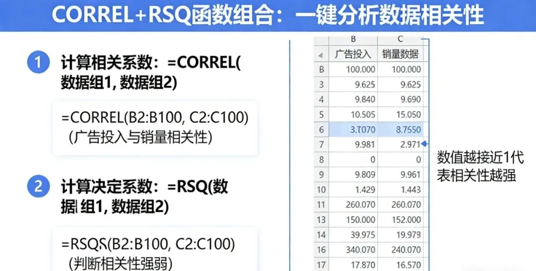 例: =RSQ(B2:B100, C2:C100) ,判断两组数据相关性的强弱。