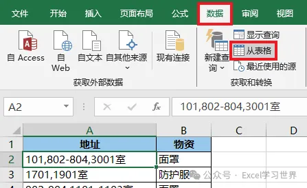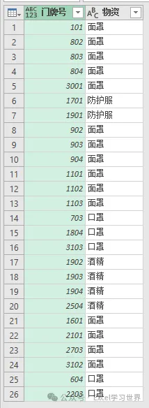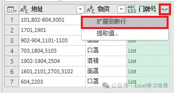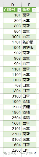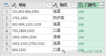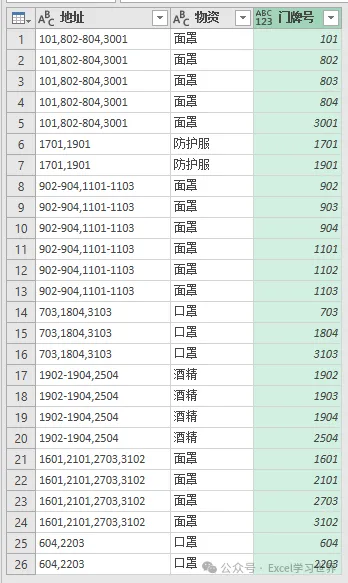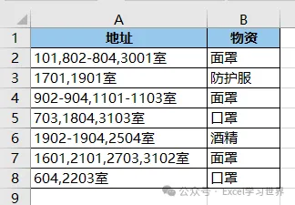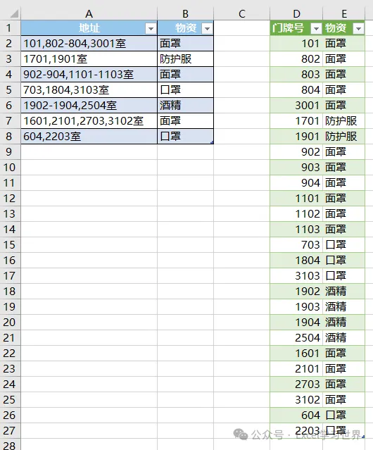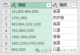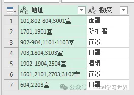 根据这个规则,将数据表整理成规范的一维表,地址和物资一一对应。