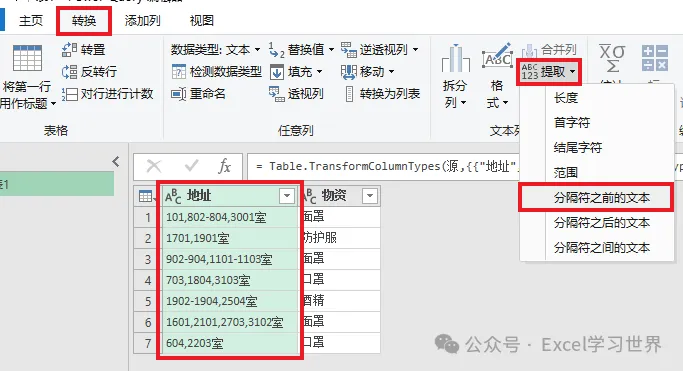 3. 选中“地址”列 –> 选择工具栏的“转换”–>“提取”–>“分隔符之前的文本”