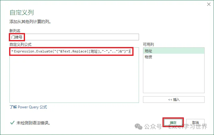 6. 在弹出的对话框中将列名设置为“门牌号”–> 输入以下公式 –> 点击“确定”: