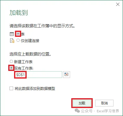 10. 在弹出的对话框中选择“表”–> 选择“现有工作表”及所需上传至的位置 –> 点击“加载”