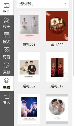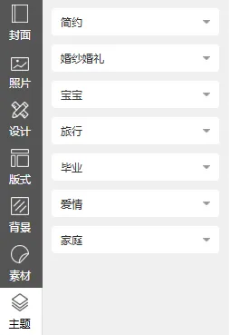 米莫照片书编辑器主题分为7类,分别为简约、婚纱婚礼、宝宝、旅行、毕业、爱情和家庭,点击各类后三角打开下拉列表,内置多少不一,精美而丰富的照片书主题模板。