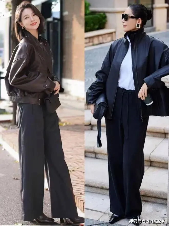 春天穿短皮衣我们可以搭配阔腿裤,主要是因为短皮衣和阔腿裤都是属于慵懒和随性的单品,将它们相互组合在一起能让我们的穿搭造型得到相互平衡,尤其是皮衣挺括的材质能够支撑身材的结构,下身宽松的阔腿裤还能隐藏腿部线条和大粗腿的问题,从而起到遮肉显瘦的效果。