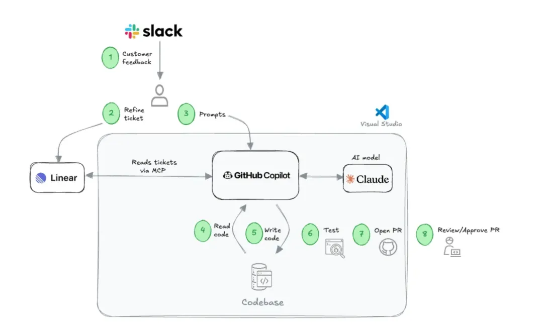 文章里分享了一个实践案例。非技术人员通过自己写 Spec,直接让 AI 修改代码库、开 PR,然后等资深工程师审核。这个流程能跑起来,靠的是三个前提条件:
