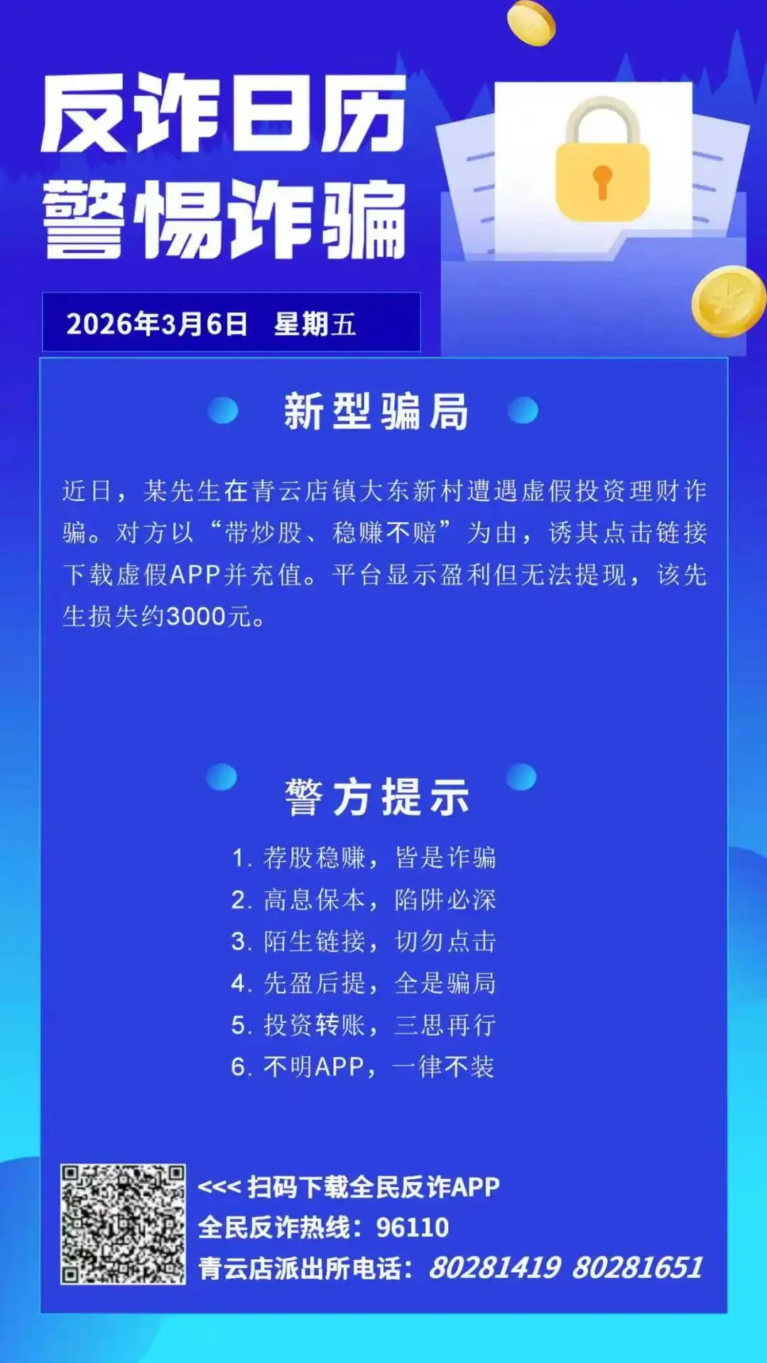 反诈宣传 | 虚假APP充值,大东一村民被骗3000元! 来源/ 青云店镇派出所 往期回顾 青润乡风 | 春风十里学雷锋,志愿服务暖青云 理论学习 | 2026年政府工作报告,一图速览! 温馨提示 | 惊蛰时节万物醒,消防安全莫忘记!