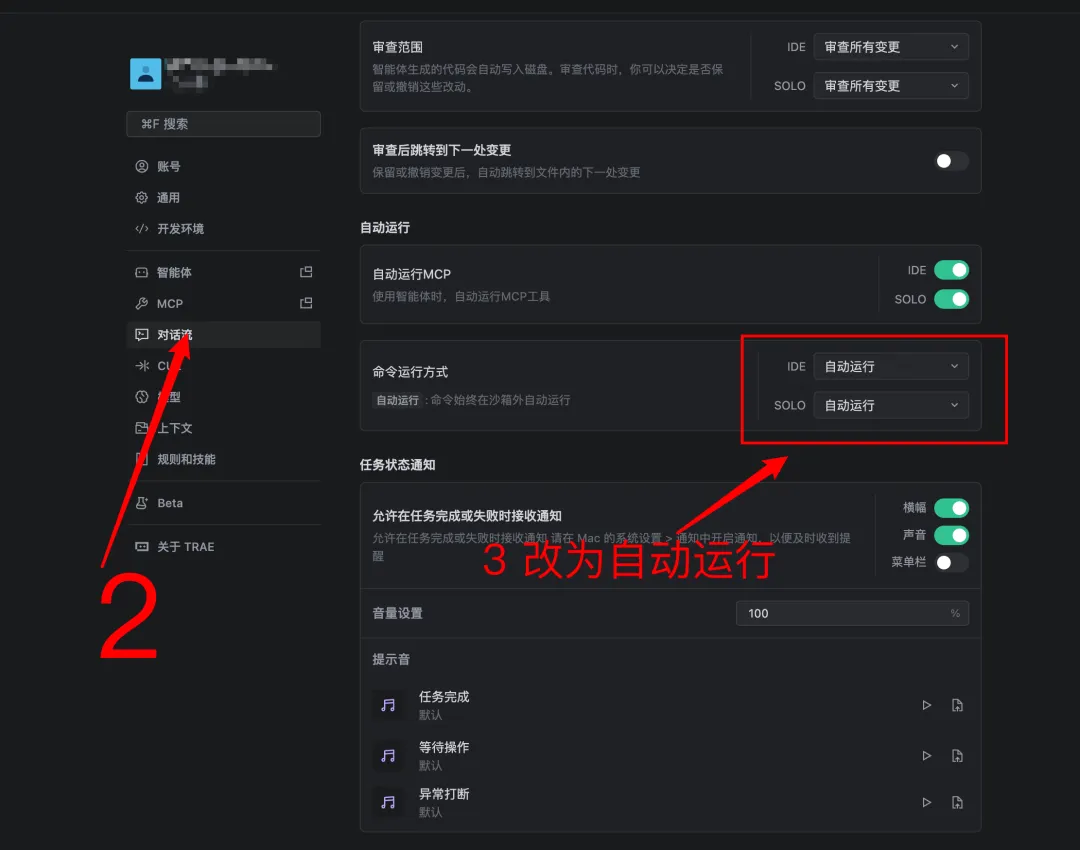 在“命令运行方式”里,把 IDE 和 SOLO 都改成 自动运行。这一步非常关键,如果不改,AI 无法真的把 OpenCode 装好。