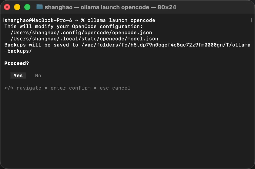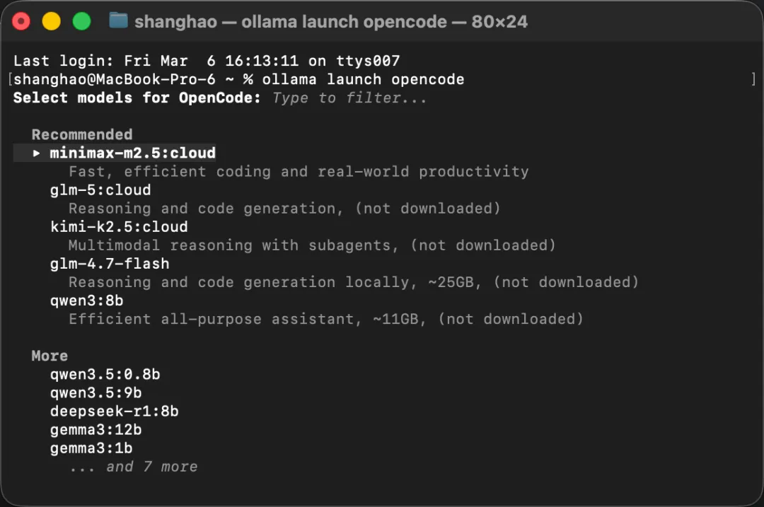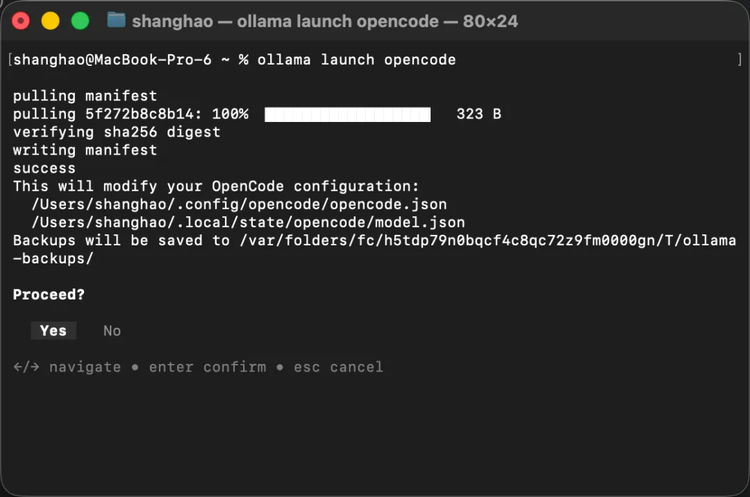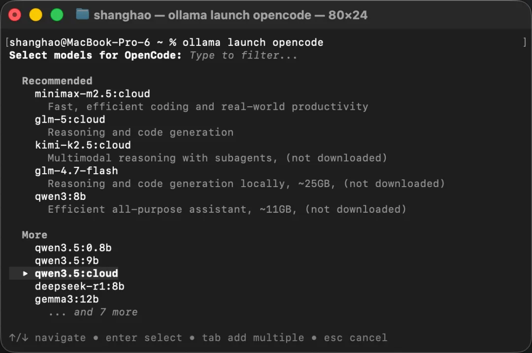 运行后,Ollama 会引导你选择模型,并自动帮你完成 OpenCode 配置。