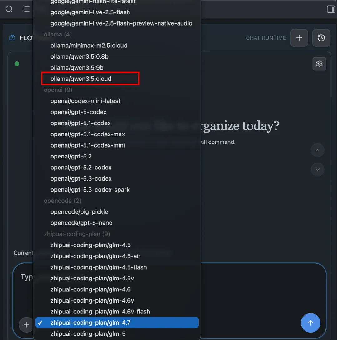 配好以后,回到 FLOWnote 或 OpenCode 的模型选择位置,选择刚才配置的 Ollama 模型即可。