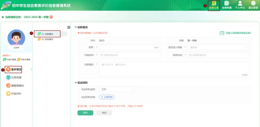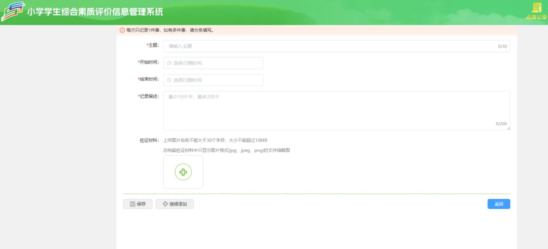 学生用户点击【点滴记录】–>【品德发展】–>【添加】按钮,根据标题、开始时间填写内容,填入后点击【保存】按钮。