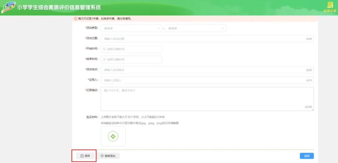 学生用户点击【劳动与社会实践】–>【添加】按钮,选择活动类型、开始和结束时间,输入活动主题、地点等。文本框后面的是当前输入的字数和最大字数限制,没有可以不上传,不是必填项。点【保存】。