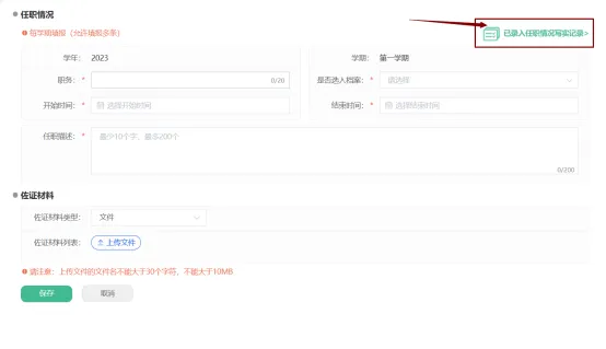 学生进入系统后点击【基本情况】–>【任职情况】然后单击添加按钮,根据职务、任职描述添加内容,添加信息后点击【保存】即可。
