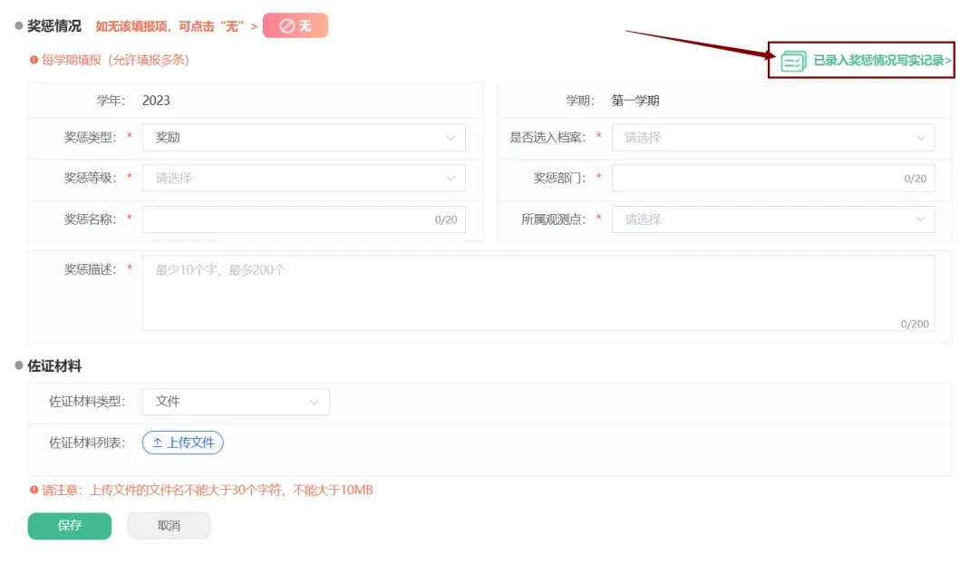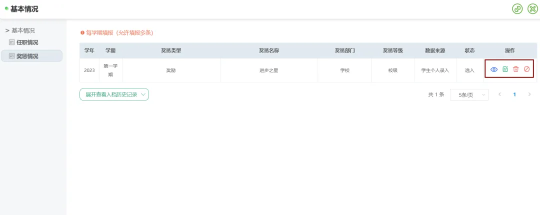 点击【点滴记录】–>【基本情况】–>【奖惩情况】可填写奖惩情况后保存。保存后可在【已录入奖惩情况写实记录】中查看、修改或者删除操作。