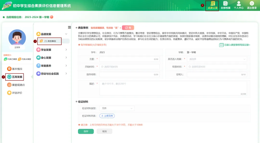 点击【点滴记录】–>【五育发展】–>【品德发展】–>【典型事例】可填写典型事例后保存。保存后可在【已录入典型事例写实记录】中查看、修改或者删除操作。