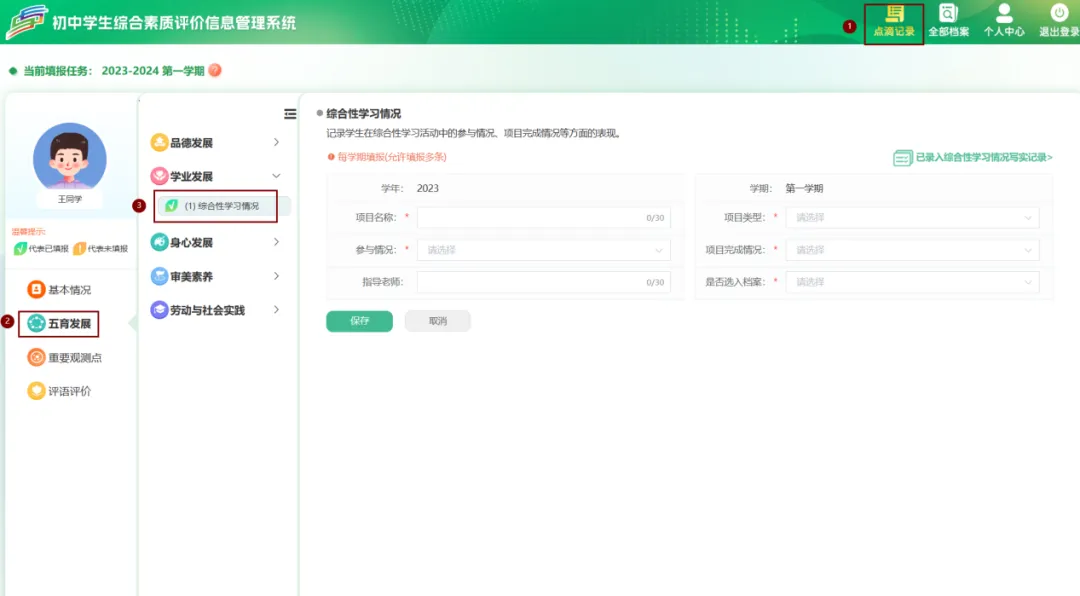 点击【点滴记录】–>【五育发展】–>【学业发展】–>【综合性学习情况】可填写综合性学习情况后保存。保存后可在【已录入综合性学习情况写实记录】中查看、修改或者删除操作。