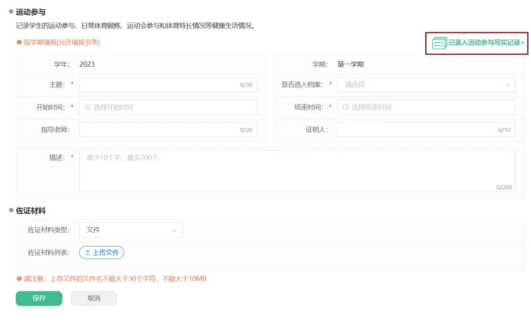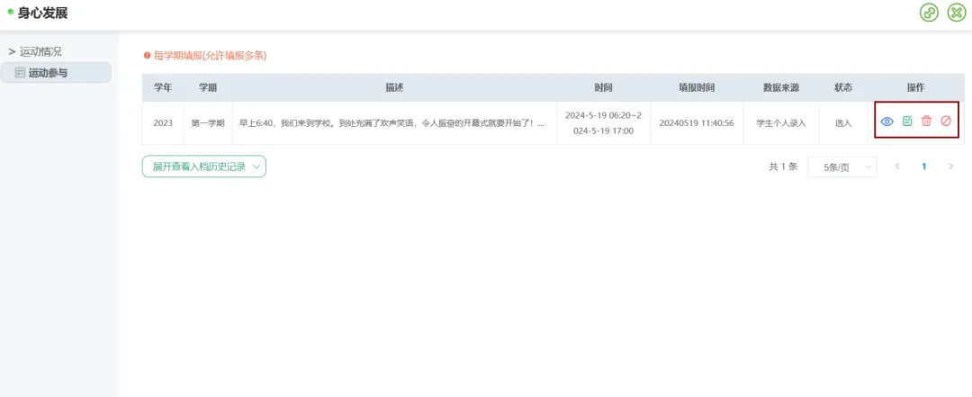点击【点滴记录】–>【五育发展】–>【身心发展】–>【运动参与】可填写运动参与后保存。保存后可在【已录入运动参与写实记录】中查看、修改或者删除操作。
