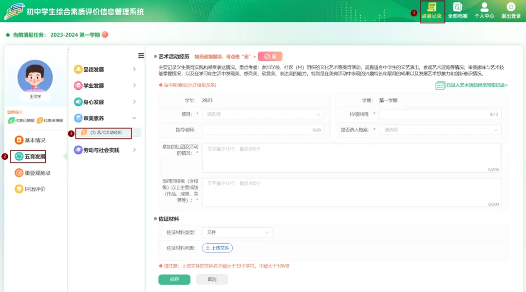 点击【点滴记录】–>【五育发展】–>【审美素养】–>【艺术活动经历】可填写艺术活动经历后保存。保存后可在【已录入艺术活动经历写实记录】中查看、修改或者删除操作。
