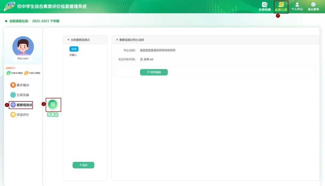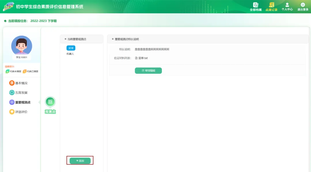 学生进入系统后点击【点滴记录】–>【学业发展】->【综合性学习情况】可添加学生的日常各门课程知识与技能的掌握情况、课堂表现、自主学习意识和能力、阅读习惯,参加学校拓展课程、社团活动,小制作、小发明科学兴趣特长等情况。