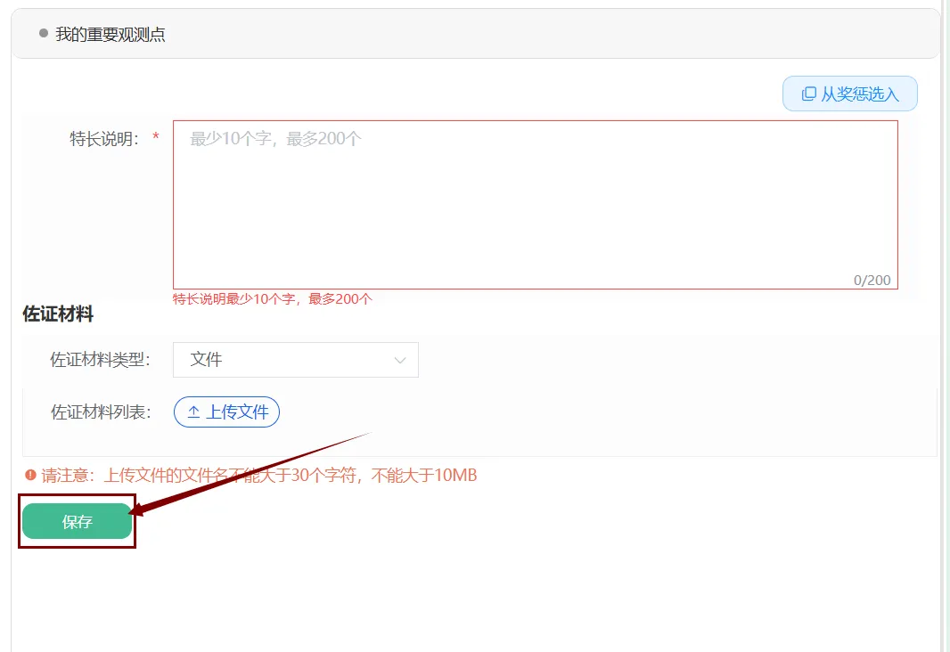 点击【观测点】,选择观测项目,点击添加,输入特长说明,最后点击保存。