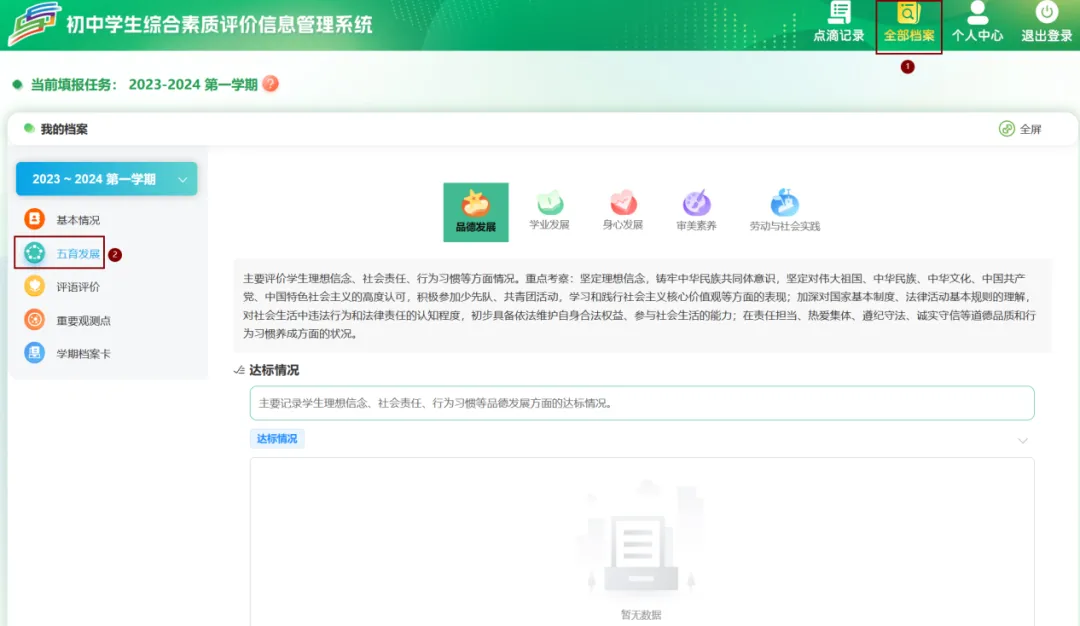 –>【五育发展】可查看学生写实记录,主要包括品德发展、学业发展、身心发展、审美素养、劳动与社会实践五个维度