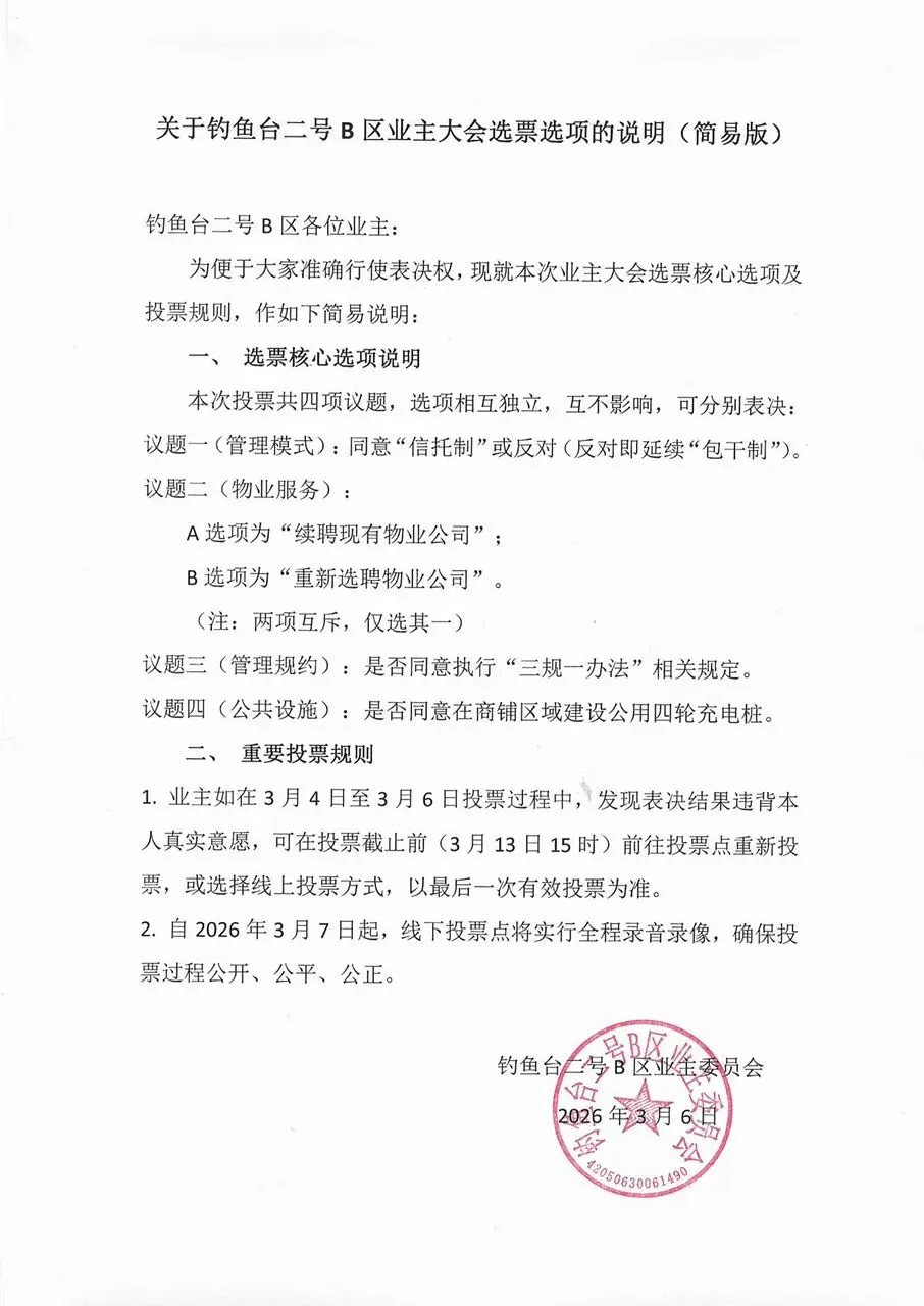 关于钓鱼台二号B区业主大会选票选项的说明