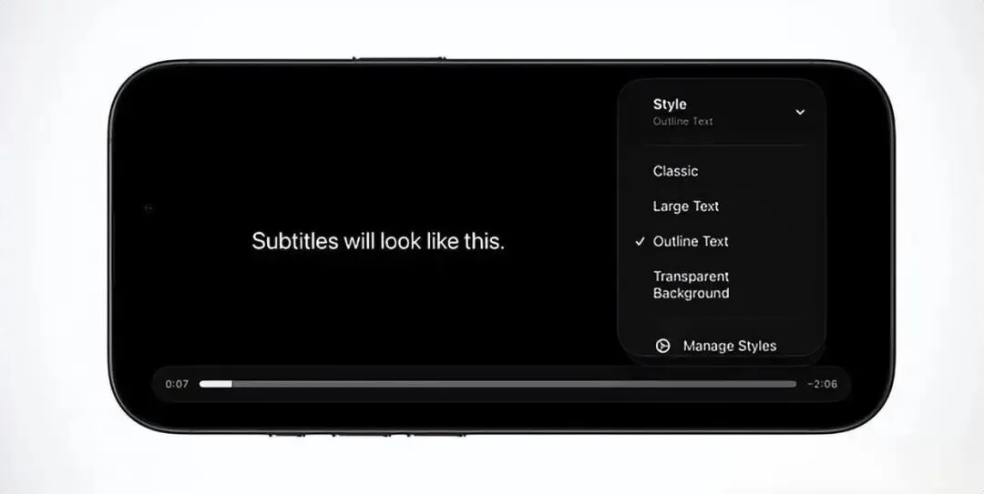 而Apple TV则为字幕党带来了实实在在的便利,之前需要进入系统设置多层级修改字幕样式的繁琐操作被简化,现在在播放界面点击字幕按钮,就能直接呼出样式选项,支持大字体、描边、透明背景等多种预设,还能通过Manage Styles自定义专属字幕样式,适配不同观看场景和视力需求。