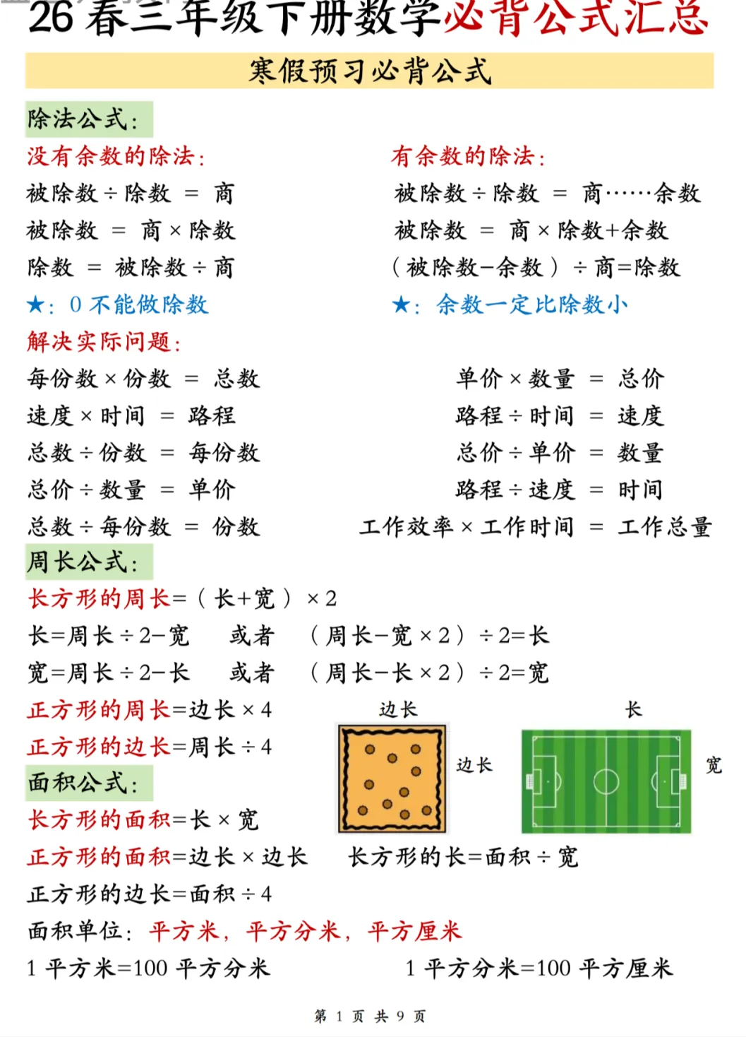 26春季最新版三年级下册数学【必背公式汇总】除法公式、周长公式、面积公式、时间单位换算、可打印