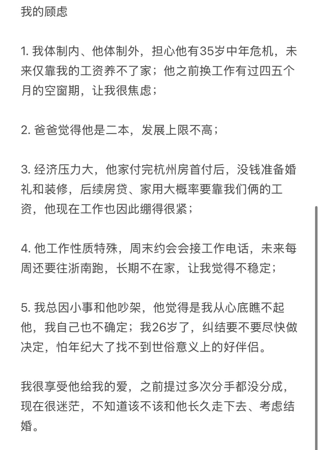 你担心和他结婚,由于对方工作不稳定让你婚后无法享受现在这样优渥的生活,你担心需要你来养家当顶梁柱,你无法接受对方失业期间需要有一段时间的修养。
