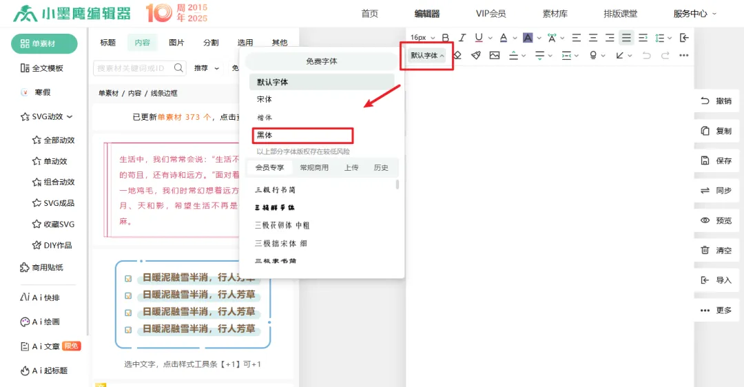 打开小墨鹰编辑器之后,顶部工具栏有个选择字体的地方,可用【默认】字体,也可以选择其他字体。