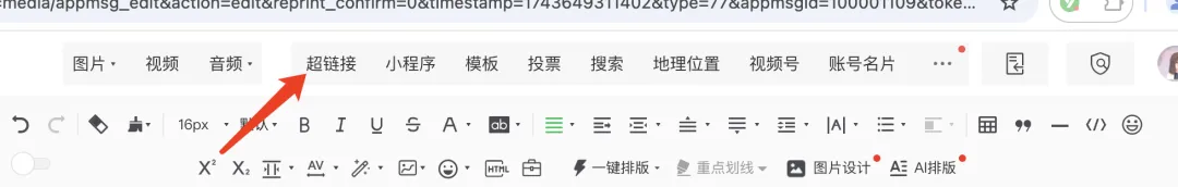 如果想要在文章中插入链接,引导读者跳转阅读自己的其他文章,那就点击后台的【超链接】三个字,进去之后选择你想要跳转的文章就行。