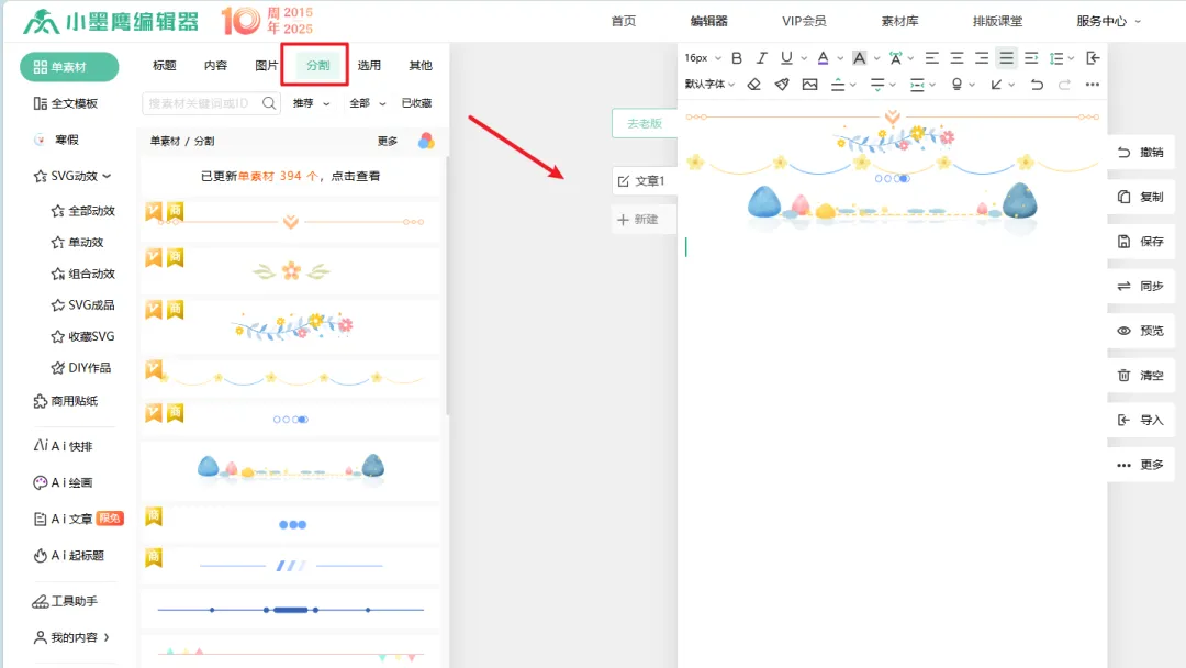 不同段落之间想用分割线,可以在小墨鹰编辑查找使用,有非常多可爱的分割线。还有很多小标题花样,可以自由编辑内容。花点时间就可以找到喜欢的素材。
